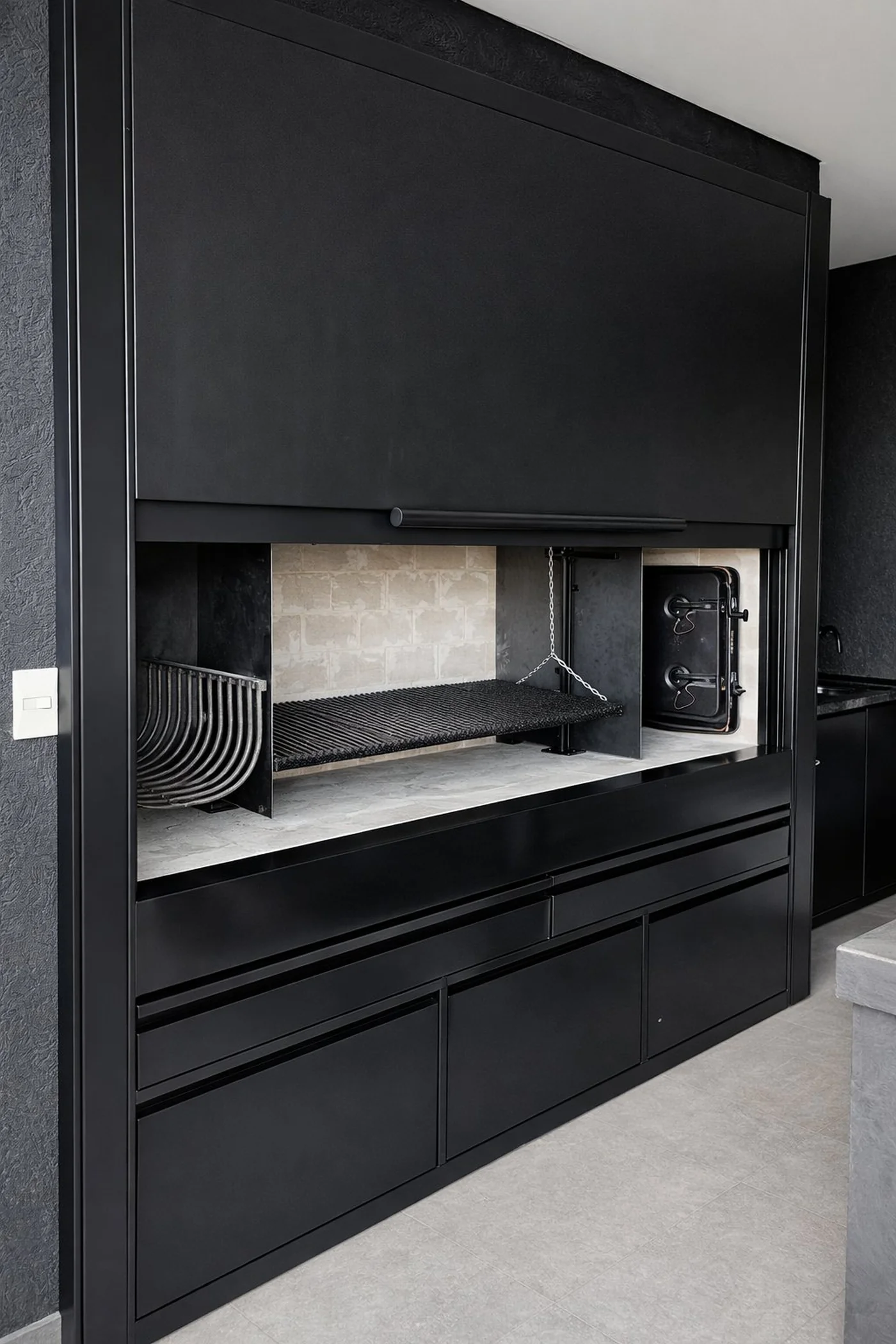 El diseño del frente define el espacio entero. Lo fabricamos con hierro estructural, soldadura completa y terminación preparada para calor y exterior. No usamos chapa fina ni piezas prefabricadas.